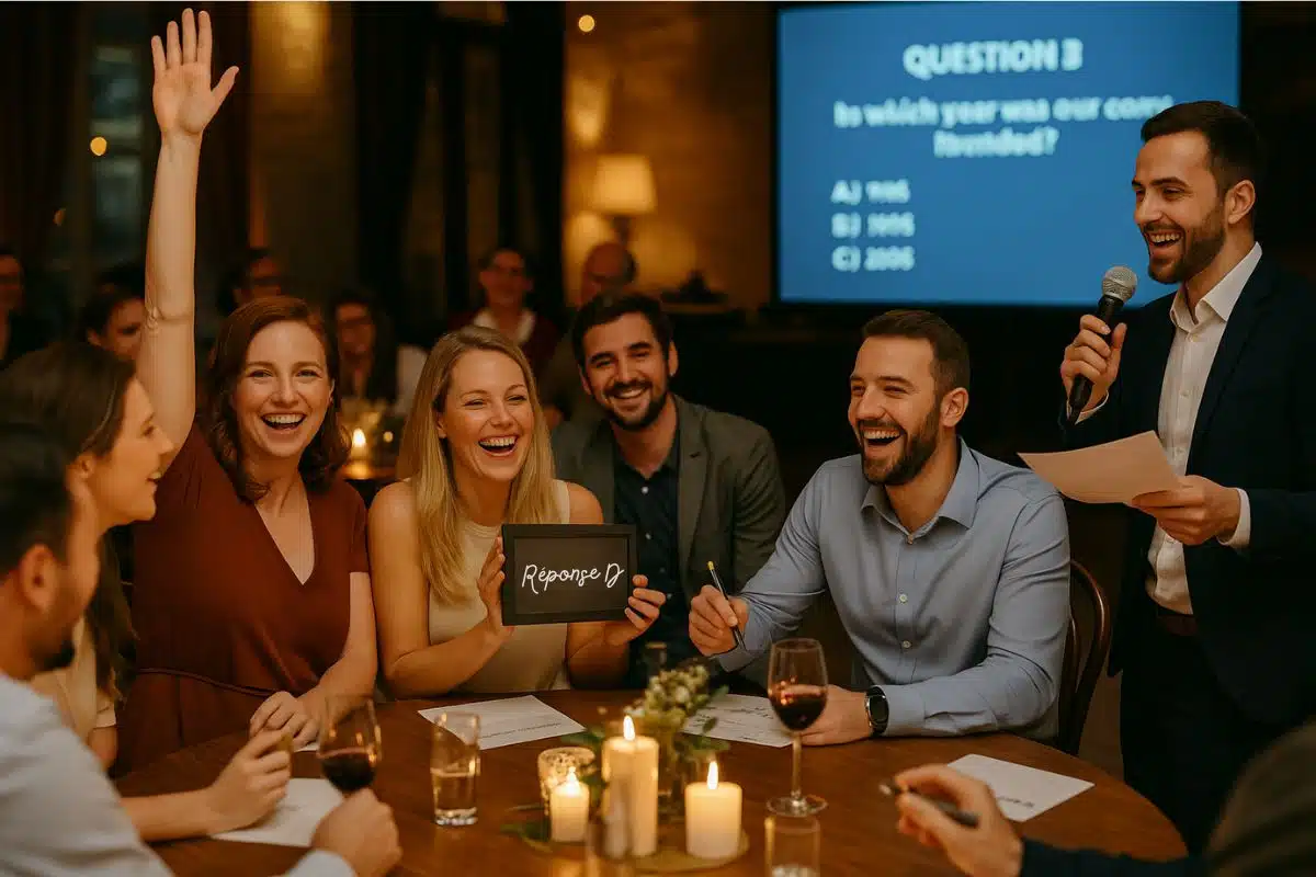 Collaborateurs participant à un quiz interactif lors d’une soirée d’entreprise, animée par un intervenant, dans une ambiance conviviale et professionnelle